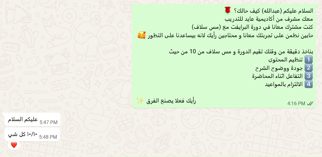 يتم إضافة الطالب إلى مجموعتين على واتساب: جروب مغلق للتنويهات ولينكات محاضرات الزوم (يتم إرسال الرابط قبل المحاضرة بدقائق). جروب مفتوح للمناقشات بين الطلاب.